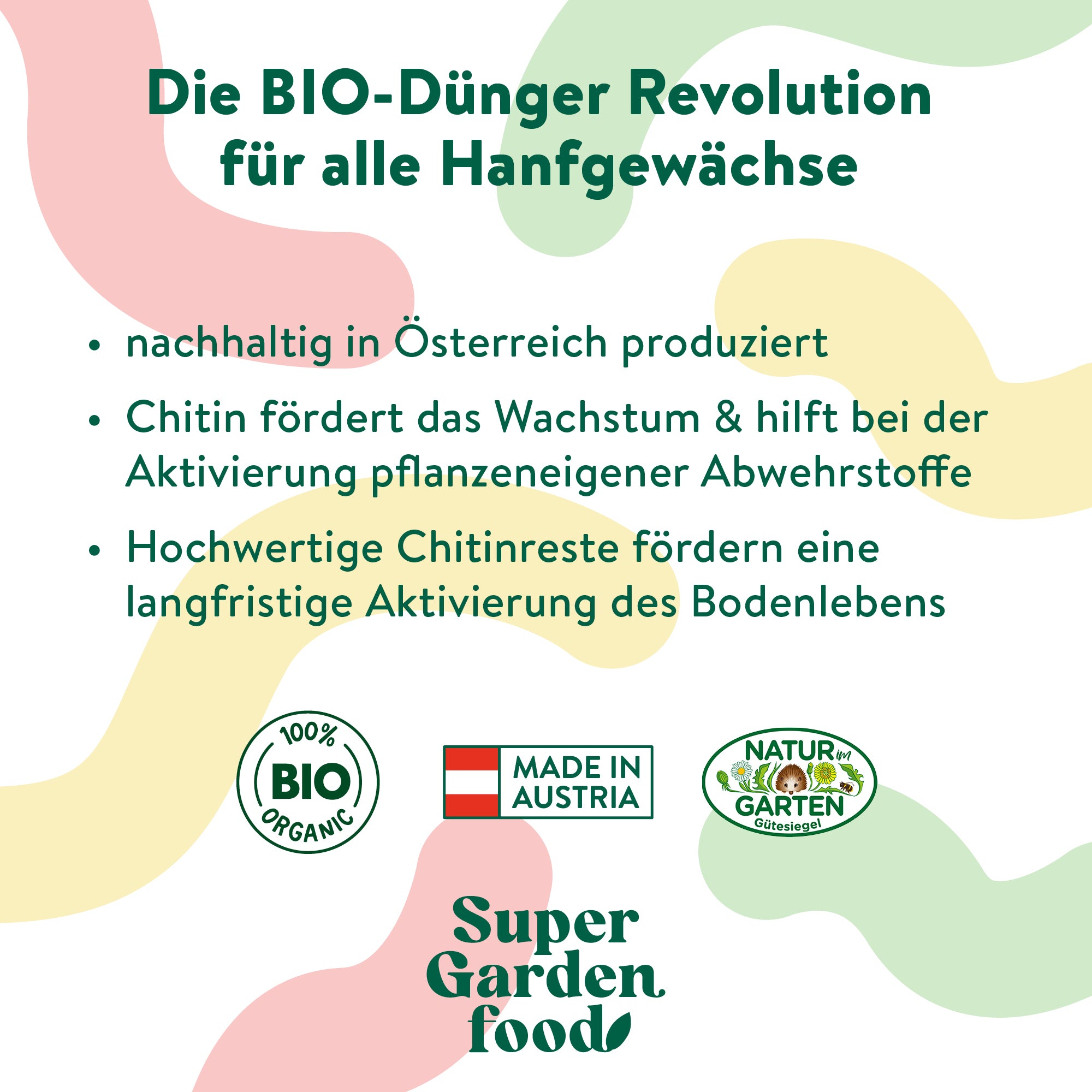 Was ist der beste Dünger für Hanfpflanzen? Unsere Antwort lautet: SuperGardenfood Bob simple growing. Bob SuperGardenfood Hanfgewächsdünger ist ein feines, angenehm riechendes Granulat das nachhaltig in Österreich produziert wird. Das enthaltene Chitin fördert das Pflanzenwachstum und hilft den Pflanzen bei der Aktivierung pflanzeneigener Abwehrstoffe und sorgt somit für kräftige Pflanzen und reichhaltige Blüten.